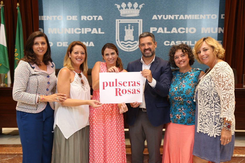 El alcalde de Rota, José Javier Ruiz Arana: la fundadora de Pulseras Rosas, Carla Herrera; Custodia Caballero de los Santos en representación de la Obra Social 'La Caixa'. la delegada de Servicios Sociales, Lourdes Couñago. y la vicepresidenta de Rolucan, Juani Montes.