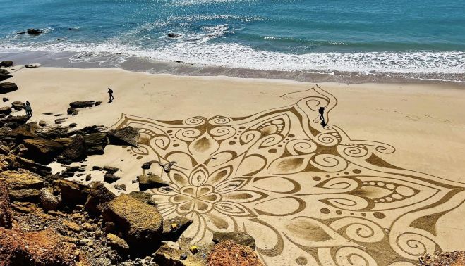 Esta semana han aparecido unos dibujos que han llamado la atención en la Cala del Aceite de Conil. Unos mandalas gigantescos adornan la arena de esta playa gaditana que, en temporada de verano, se llena de turistas. El alma máter de esta obra ha aprovechado el escaso trasiego en estos meses para llevar a cabo un proyecto que busca remover conciencias, más allá del deleite estético que supone a vista de pájaro.