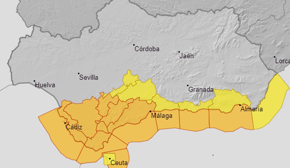 Mientras según la Agencia Española de meteorología se mantienen los avisos naranja por viento y fenómenos costeros, tanto en el litoral como como en la campiña y la sierra de Cádiz. Para viernes y sábado. Viento de levante con rachas de hasta 90 km/h que pueden alcanzar los 100 en la costa y mantenerse hasta el domingo.