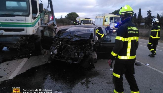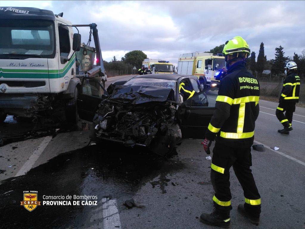 Bomberos del Consorcio de la Provincia de Cádiz han tenido que rescatar a una mujer tras el choque frontal entre un turismo y un camión cuba. En cada vehículo viaja un único ocupante.