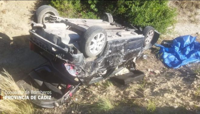 Bomberos de Jerez han tenido que intervenir para rescatar al conductor del vehículo, que ha acabado volcado fuera de la calzada. La acompañante sí ha logrado salir por su propio pie y ha sido atendida por sanitarios en la cuneta de la carretera.