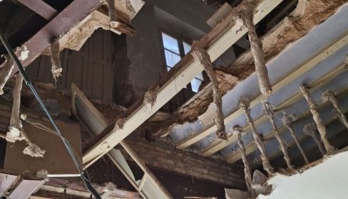 Una vez en el lugar, y junto a técnicos del área de Urbanismo, los efectivos comprobaron que no solo se habían desprendido ladrillos, sino también cuatro vigas, el relleno del techo y parte del suelo de la planta superior, dejando al descubierto el interior del inmueble. A pesar de que la planta afectada se encontraba desocupada, la magnitud de los daños obligó a adoptar medidas inmediatas para garantizar la seguridad.