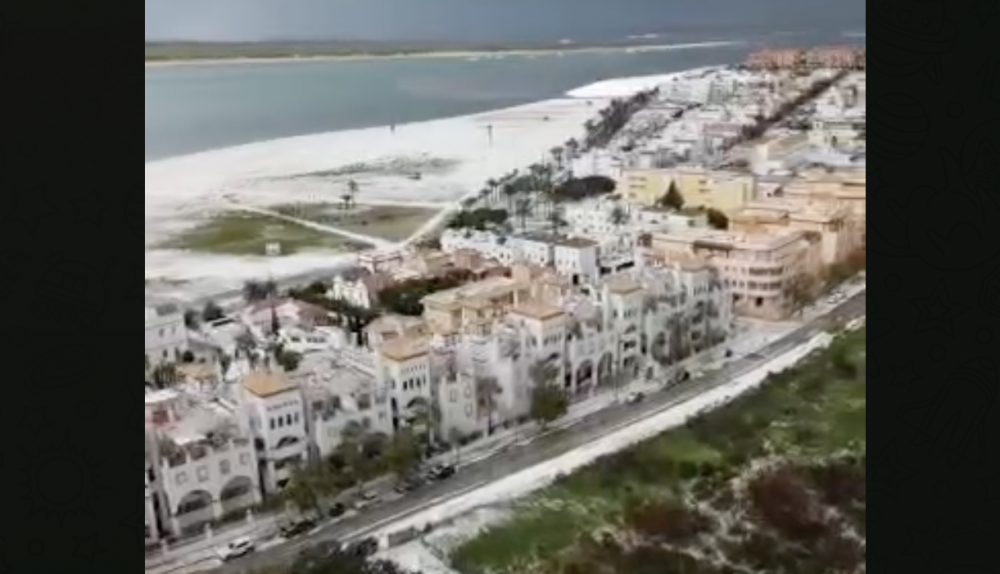 Un vecino de Sanlúcar, tras la tromba, ha grabado el estado de Sanlúcar con un dron, con el que ha recorrido distintas zonas. En el vídeo se ve la playa de Bonanza y distintas barriadas de la ciudad, cubiertas de un manto blanco.