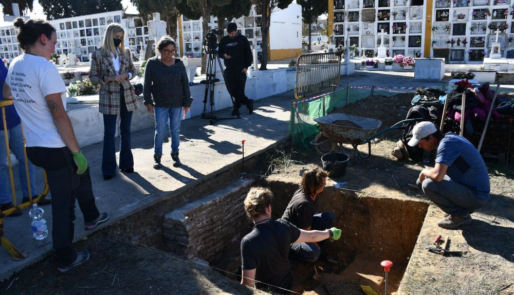 Un equipo técnico, coordinado por la arqueóloga María José Gámez, y voluntarios del Foro por la Memoria de El Puerto de Santa María se afanan, desde ayer lunes, en los nuevos sondeos que pueden deparar la localización de fosas con represaliados en el cementerio portuense.