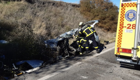 El camión ha volcado en la cuneta con derrame de la carga, mientras que los ocupantes del vehículo han quedado atrapados en el interior del habitáculo, hecho un amasijo.