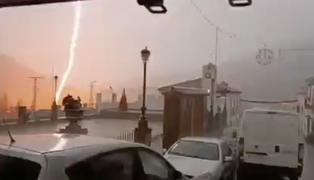 El vídeo se ha viralizado. El brutal impactó de un rayo de grandes dimensiones en el transformador de luz de Benamahoma, pedanía de Grazalema, en pleno Parque Natural de la Sierra gaditana, se ha registrado en vídeo este viernes.