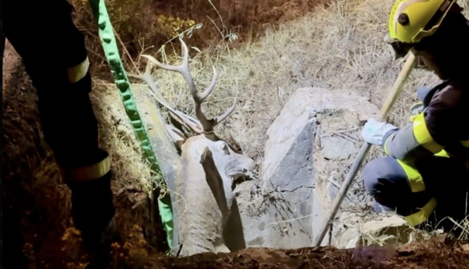 Los bomberos del parque de Jimena de la Frontera han liberado a un ciervo atrapado en una arqueta en la CA-8201, concretamente en el kilómetro 3.