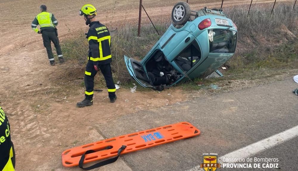 Bomberos de Ubrique y Arcos han intervenido en la mañana de este jueves en un accidente por salida de vía en la carretera Arcos-El Bosque, específicamente en el Km. 21 de la A-372 de esta carretera de la Sierra de Cádiz. El suceso involucró a un turismo ocupado por un padre e hijo, resultando en el vehículo encastrado en la cuneta de hormigón, con el techo sobre el suelo y posición boca abajo.