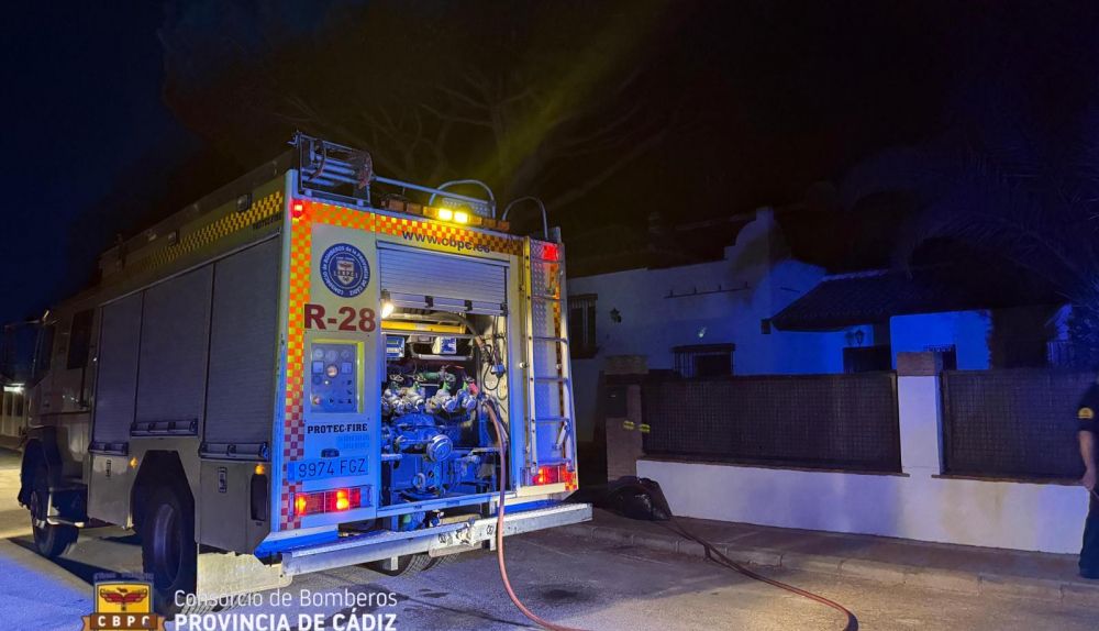 Efectivos de los Bomberos de Conil han acudido a realizar labores de extinción de un fuego originado en una casa en la urbanización de Roche, en Conil, en la noche de este viernes.