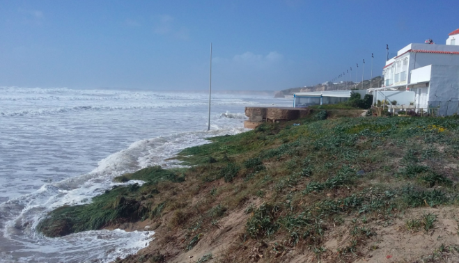 Conil tampoco se ha librado de Emma. El Ayuntamiento se ha visto obligado a cortar los accesos a las playas, que como se aprecia también se han inundado por completo.