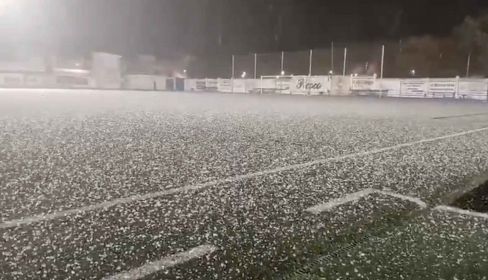 En Chipiona, el césped del estadio municipal Gutiérrez Amérigo ha quedado cubierto completamente de blanco en cuestión de minutos. Una imagen más típica de campos de fútbol de latitudes del norte de Europa.