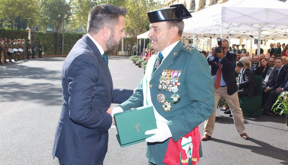 El delegado del Estado en la Zona Franca de Cádiz, Fran González, ha recibido esta mañana en Sevilla el Tricornio de Gala de la Guardia Civil durante el acto institucional celebrado en la sede de la Jefatura de la IV Zona de la Guardia Civil de Andalucía con motivo del día de la Virgen del Pilar, patrona del Cuerpo.