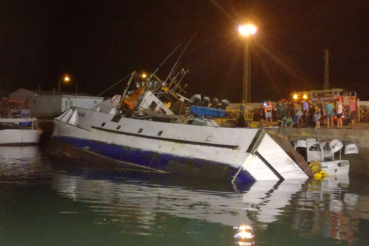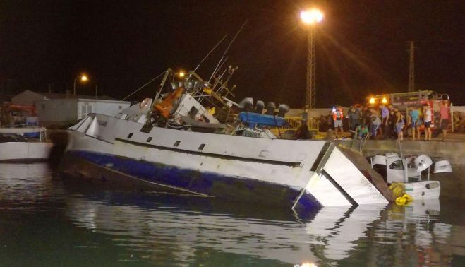 El cerquero Nuevo Nautilus ha quedado semihundido tras un percance sufrido estando atracado, sin personas dentro, en el puerto de La Albufera de Barbate.