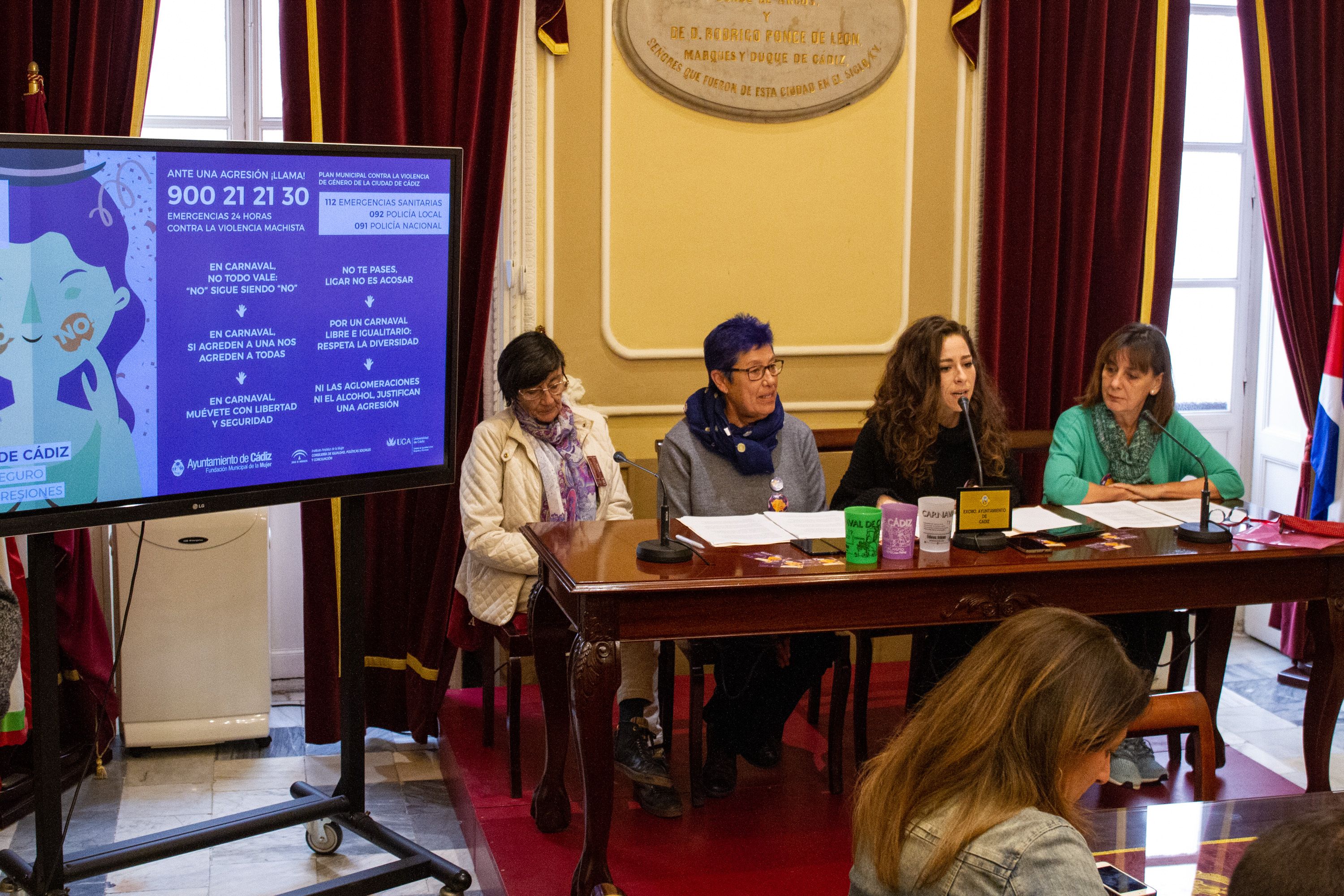 La concejala de Fiestas, María Romay, la concejala de Mujer, Ana Camelo, la directora de la Unidad de Igualdad entre mujeres y hombres de la Universidad de Cádiz, María Luisa de la Flor y Ángeles Ibáñez, en representación de los colectivos feministas, han presentado la tercera edición de la campaña No es No. Carnaval sin violencias que tiene como objetivo conseguir que el Carnaval sea un espacio de alegría, tolerancia y respeto a todas las personas, donde se acepta la diversidad sin exclusiones.