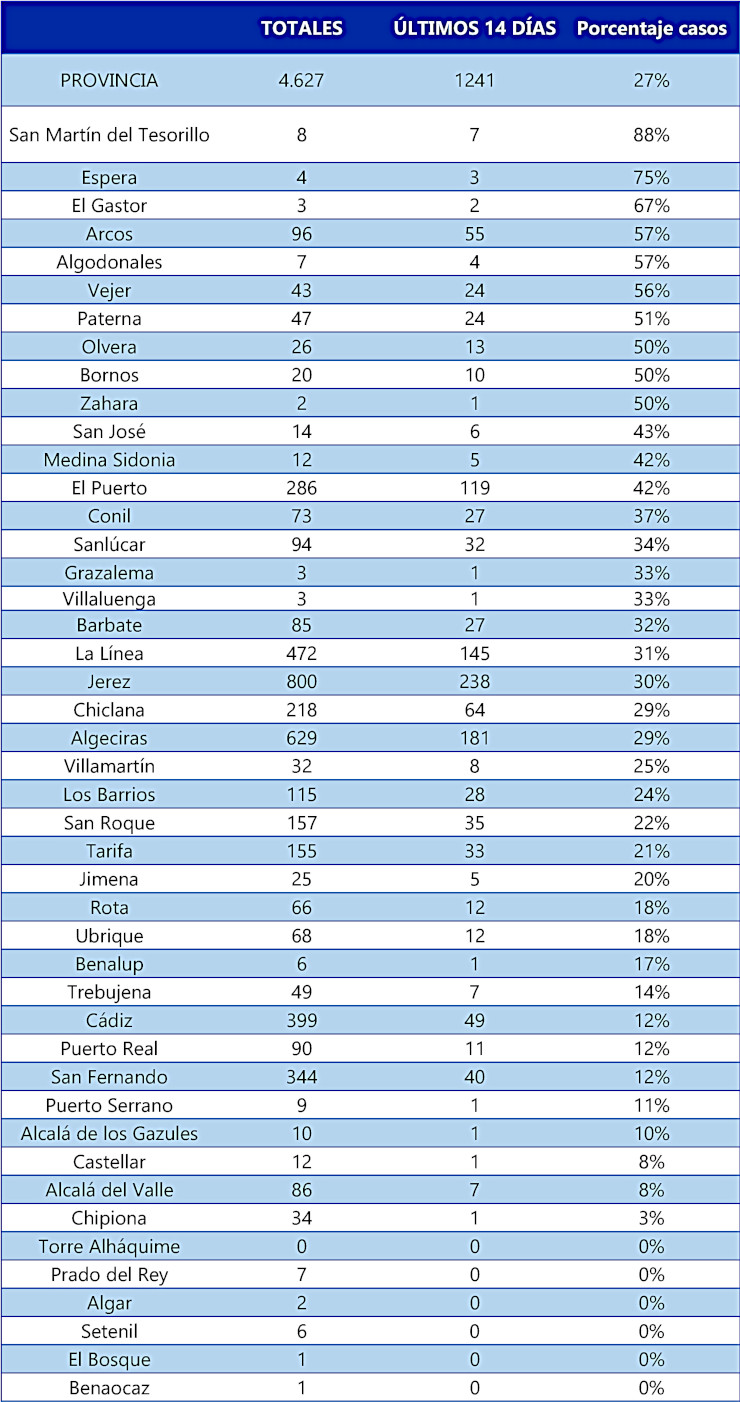 Porcentualmente, los más castigados en la última ola son varios municipios pequeños que apenas tenían casos hasta hace poco. Es el caso de San Martín del Tesorillo, donde siete de los ocho casos registrados en la localidad son de las últimas dos semanas. En situaciones similares están Espera, El Gastor, Paterna, Olvera, Bornos, Zahara o San José del Valle. Esto implica, más que un aumento del ritmo de contagios, la simple aparición por vez primera de contagios en esas localidades.