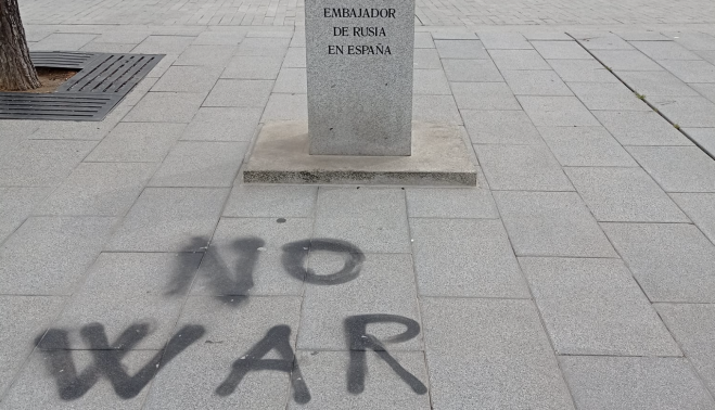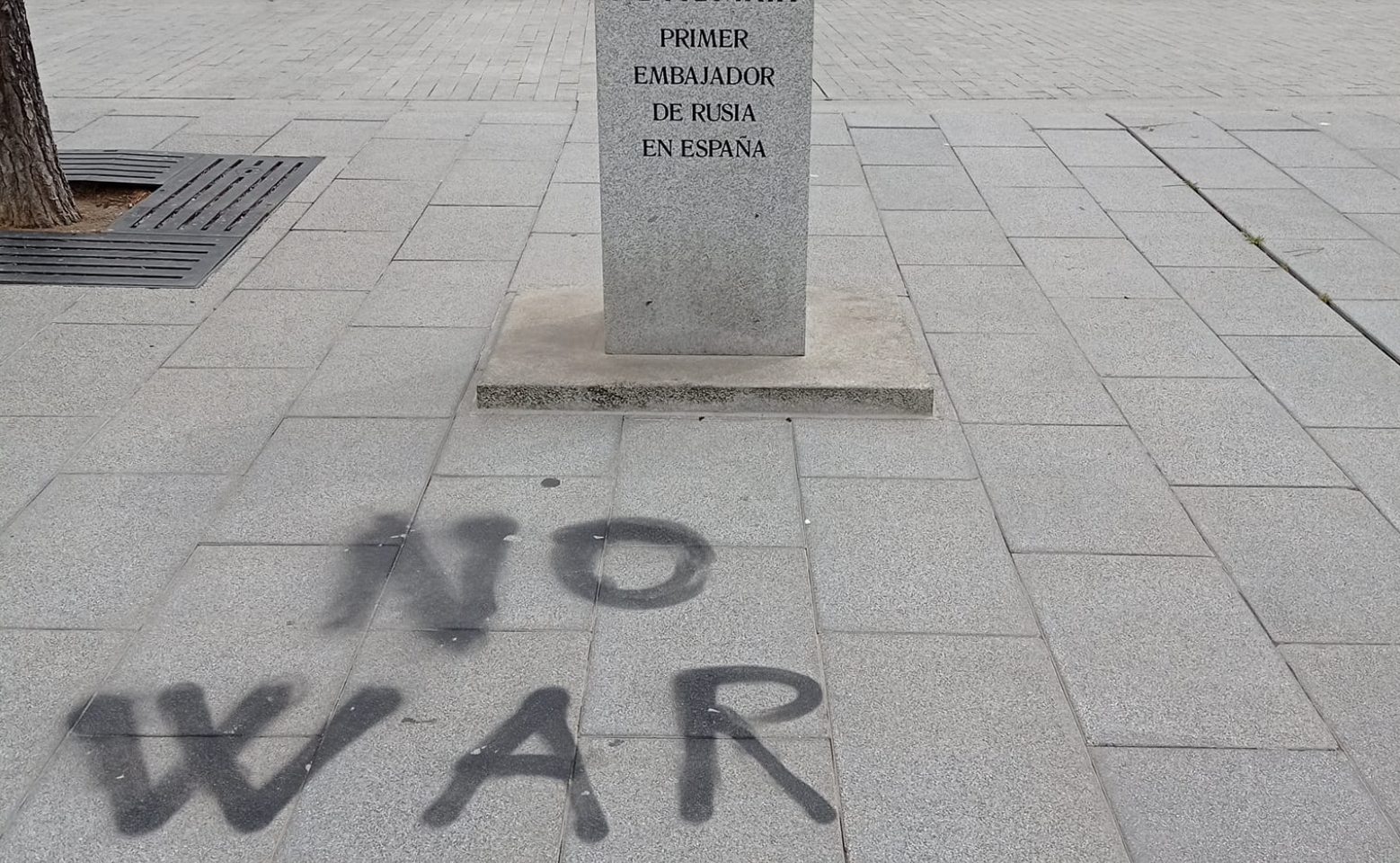 La figura, colocada en señal de hermanamiento con Rusia, ha sido testigo de un acto vandálico que pone de manifiesto la rabia que la población siente al ver el sufrimiento causado por la guerra. La pintada realizada en el suelo se encuentra junto al monolito conmemorativo de los 350 años de creación de la primera embajada de Rusia en España.