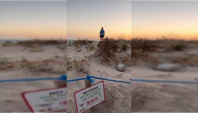 En el vídeo se observa un cartel en el que se puede leer la prohibición de pasar por la presencia de flora y fauna protegida. Además, la zona está acordonada. "Gente con kilómetros de playa para fotografiar el atardecer, que lo hace desde unas poquitas dunas protegidas. Esa gente… Todas las tardes lo mismo. Los carteles son claritos alertando el daño y la zona está acordonada. Ahí no se entra. Ahí no se pisa", denuncia Nieto.