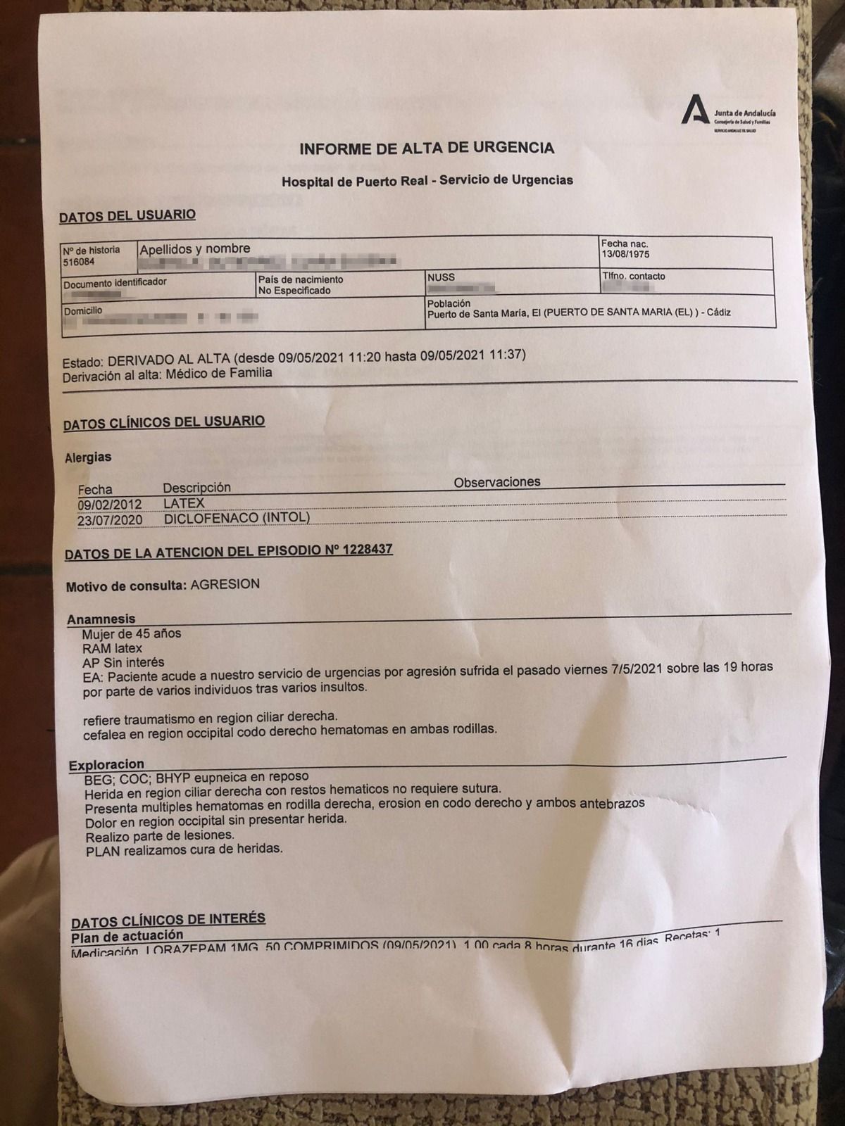 La denunciante aportó un parte de lesiones del servicio de Urgencias del Hospital de Puerto Real, al que tuvo que desplazarse tras lo ocurrido. Tuvo que ser atendida debido a los hematomas y heridas, entre otras dolencias, que presentaba según este documento.