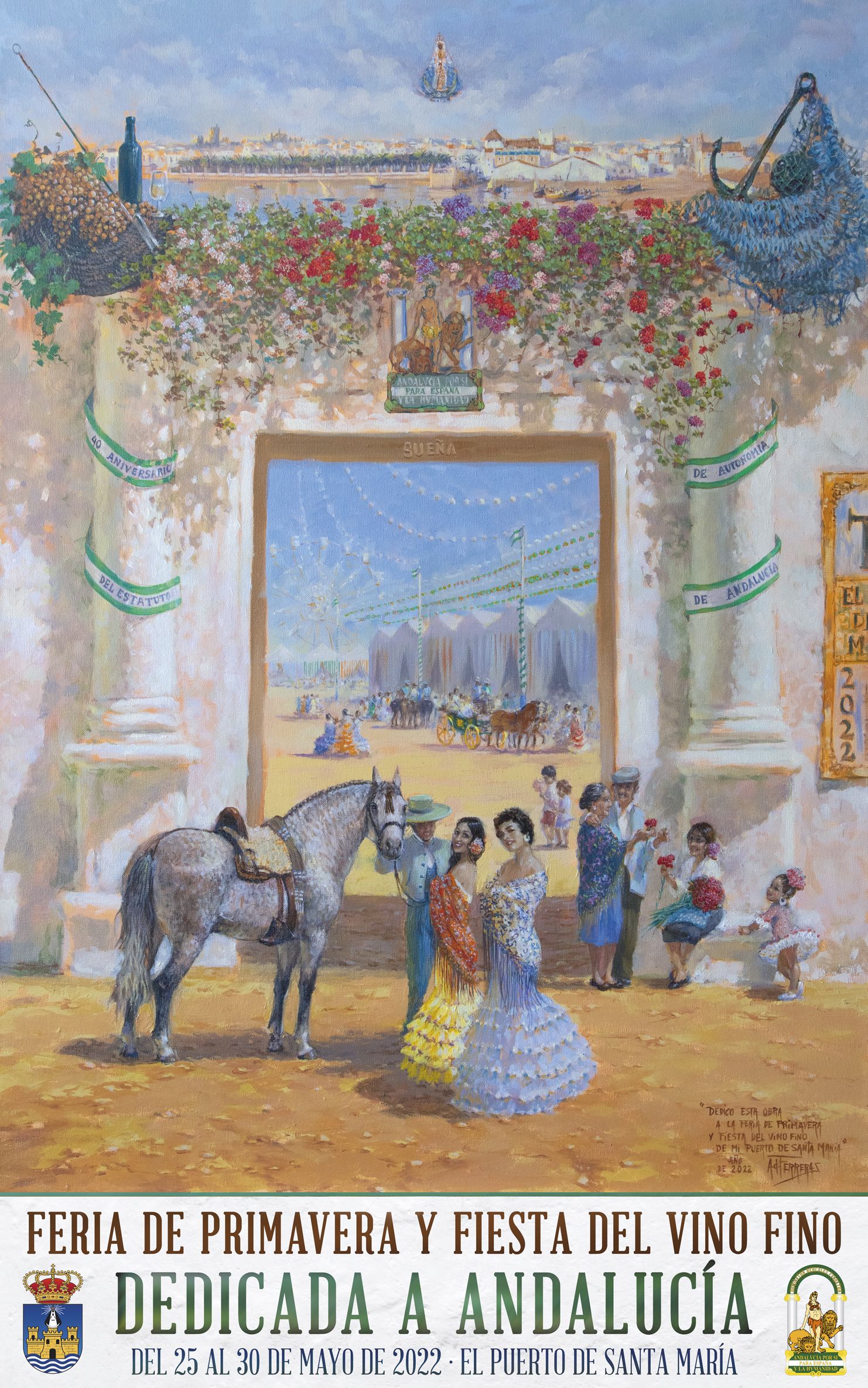 Germán Beardo, primer edil de la ciudad, fue el encargado de descubrir el cartel junto a su autor, Adrián Ferreras, confirmando que su obra ya convertida en afiche nos devuelve la alegría tras una larga espera, convirtiéndose en una magnífica tarjeta de presentación de la feria y de El Puerto, “una creación que representa lo mejor de la ciudad y nos hace sentirnos orgullosos de una de las localidades donde mejor se vive de Andalucía, abierta al visitante, generosa y que tiene en sus gentes su mayor riqueza”. Beardo anunció que del 16 al 24 de mayo se vivirá una pre-feria en el centro de la ciudad antes de disfrutar en Las Banderas de la Fiesta del Vino Fino, con el objetivo de que nuestros hosteleros también se recuperen después del esfuerzo de la pandemia, para luego irnos todos juntos a las calles del Real.