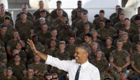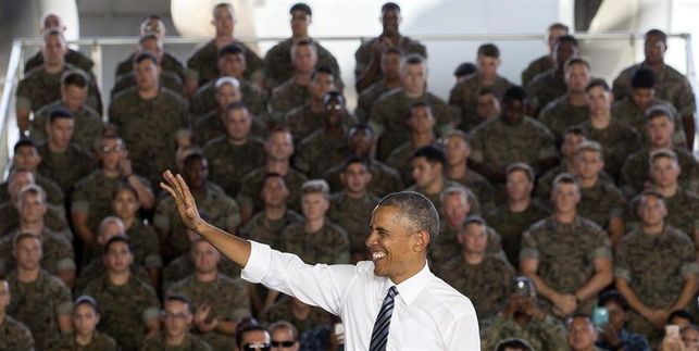 Poco más de 15 minutos duraba el discurso del presidente de Estados Unidos dirigido a sus compatriotas desplazados en la base naval de Rota desde un hangar habilitado a tal efecto. Barack Obama había aterrizado, procedente de Torrejón de Ardoz, a las 17:30 horas y tras ser recibido por el ministro de Defensa en funciones, Pedro Morenés; el Almirante Jefe del Estado Mayor de la Armada, Jaime Muñoz-Delgado; y el jefe de la Base, Mike Macnicholl, entre otras autoridades civiles y militares, se trasladaba al muelle número uno para visitar el destructor estadounidense 'USS Ross', uno de los cuatro desplegados en esta base en el marco del escudo antimisiles de la OTAN.