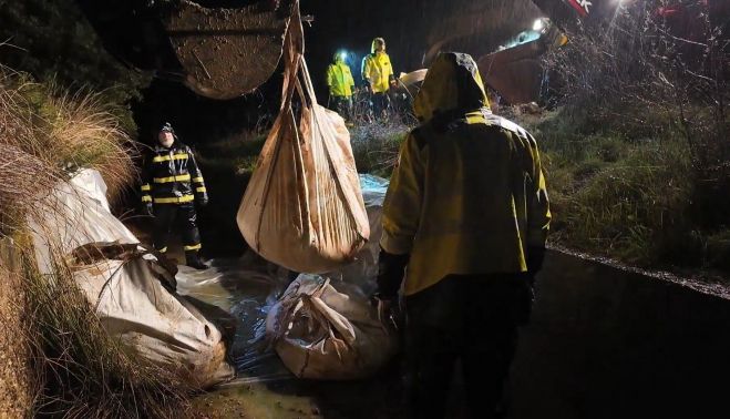 📽 Imágenes de las misiones realizadas esta madrugada por las unidades de la #UME desplegadas en la mina Los Frailes #Sevilla, construyendo un muro 🧱 de contención con Hesco Bastión y maquinaria pesada.#BorrascaLeonardo pic.twitter.com/3j5N4VxJYQ