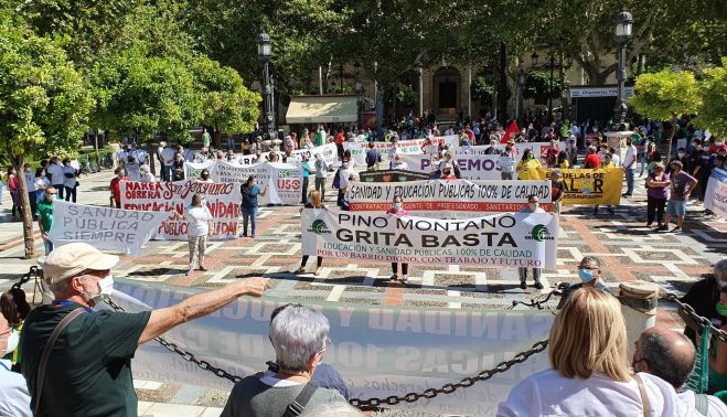 Los colectivos Marea Blanca, Marea Verde y Barrios Hartos han celebrado este sábado una manifestación desde el palacio de San Telmo, sede del Gobierno andaluz, a la Plaza Nueva, donde se alza el Ayuntamiento de Sevilla, en demanda de la incorporación de más personal a los sistemas públicos de Sanidad y Educación, ante la "privatización" de los mismos y el "improvisado" comienzo del nuevo curso escolar, marcado por los brotes en los centros.