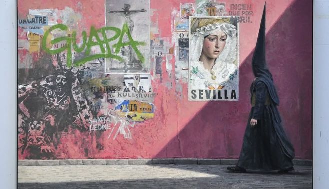 Tampoco es casual que el nazareno sea precisamente del Gran Poder y la Virgen del cartel sea la Macarena. “He querido reflejar las dos formas que tiene esta ciudad de entender la Semana Santa”, ha señalado el pintor. Esas dos formas, entendidas como seriedad máxima y alegría, o sombra y luz, o recogida solemnidad y desbordado júbilo, están separadas (o unidas) por la arista o diagonal lumínica que atraviesa justamente la palabra Sevilla. “Formas distintas pero complementarias”, entiende Gallego.