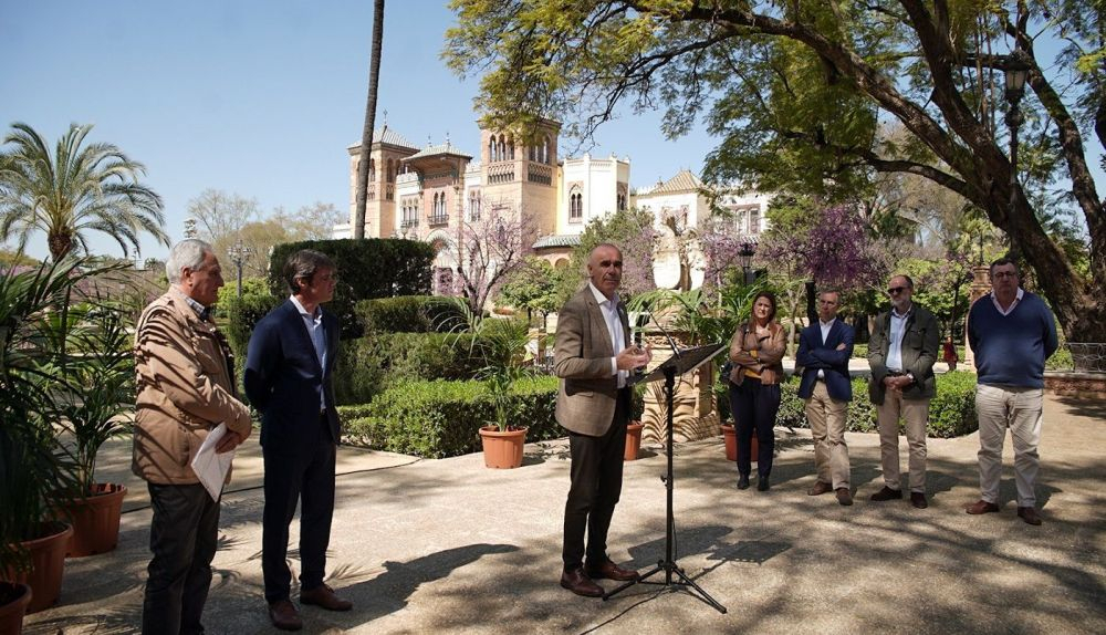 El alcalde de Sevilla, Antonio Muñoz, acompañado por el delegado de Transición Ecológica y Deportes, David Guevara, ha presentado hoy el nuevo contrato para las zonas verdes de la ciudad, que implicará un nuevo modelo que supone el mayor contrato público que ha hecho el Ayuntamiento y que incluye la planificación en cinco años de 150 millones de euros destinados a la gestión de las zonas verdes y el arbolado distribuidos en cuatro anualidades, lo que supone 30 millones de euros al año.