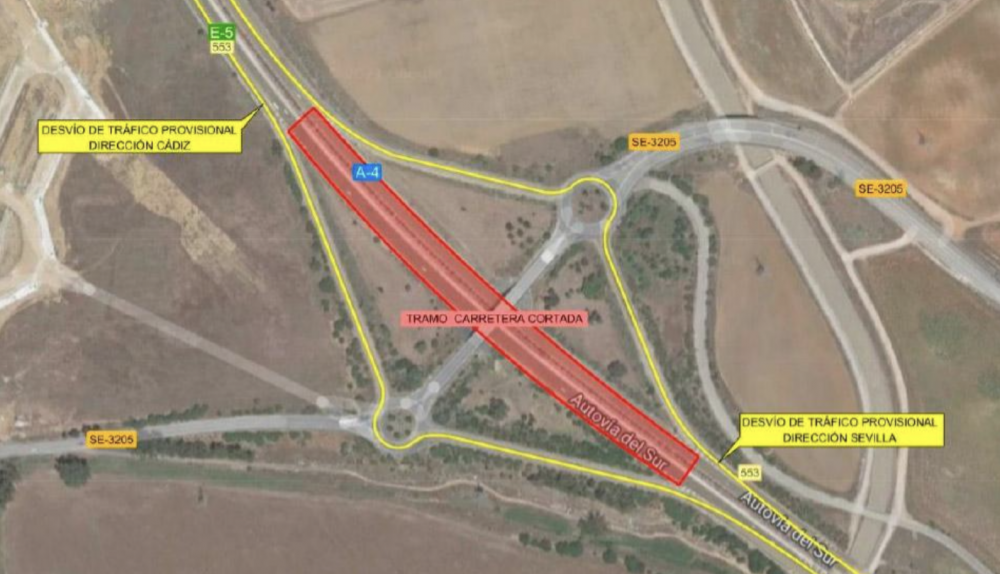 Debido a las obras de remodelación del enlace existente en el P.K.553 de la autovía A-4, con la carretera SE-3205, y que sirve de acceso sur a Dos Hermanas, se va a producir un corte total de ambas calzadas de la autovía desde las 20.30 horas de este miércoles 21 de julio en sentido Sevilla y 21.30 horas del mismo día en sentido Cádiz, hasta las 06.00 horas del próximo jueves 22 de julio.