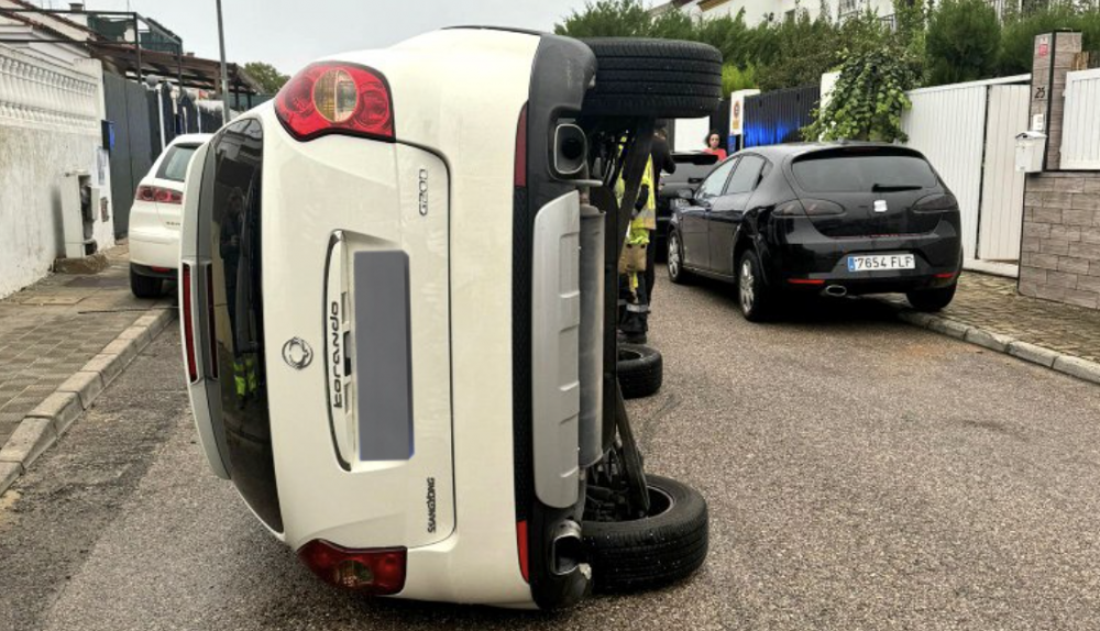 Aparatoso vuelco de un vehículo en una urbanización de la provincia de Sevilla.