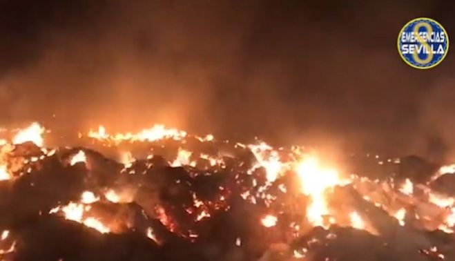 Tras nueve horas de trabajo intenso, la gran acumulación de material combustible hace que las llamas se mantenga tal y como se observa en el vídeo compartido por Emergencias Sevilla. Un retén de Bomberos ha permanecido en un dispositivo preventivo dentro el recinto incendiado, para perimetrar la zona y evitar la propagación de las llamas.