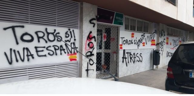 En la sede del Partido Popular se pueden leer insultos al partido y las frases "Distancia no" o "Toros sí", la última de ellas se repite en las pintadas realizadas en las sedes de Podemos y en la de los socialistas sevillanos, donde también se pide la dimisión del presidente del Gobierno. En el edificio de la formación morada, los insultos van dirigidos al vicepresidente del Ejecutivo español, Pablo Iglesias y se distingue silicona en las cerraduras.
