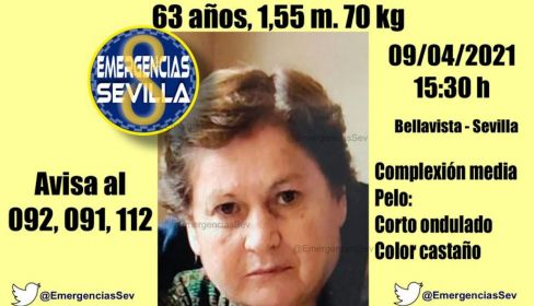 El perfil de Twitter de Emergencias Sevilla y el de SOS Desaparecidos se han hecho eco de la desaparición -sobre las 15.30 horas- de esta mujer, que mide 1,55 metros y pesa unos 70 kilogramos. De complexión media, tiene los ojos marrones y el pelo corto, ondulado y castaño.