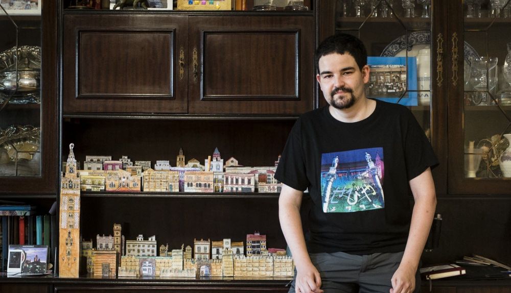 Hay una pequeña Sevilla a color en el mueble principal de su salón. "Ahora mismo tengo 70 edificios en la maqueta. Al principio eran de cajas de medicamento, ahora también tengo de cajas de latas de conservas, que me vienen muy bien para las calles de casas bajitas", explica Bernar, que dice no seguir ningún criterio, ya que hay edificios de diferentes barrios. "Hay gente que me pide que haga su casa, o su comercio, o su bar… En ese caso hago dos cajitas, una para esa persona y otra me la quedo", comenta el dibujante, que sigue recibiendo cajas de amigos y familiares.