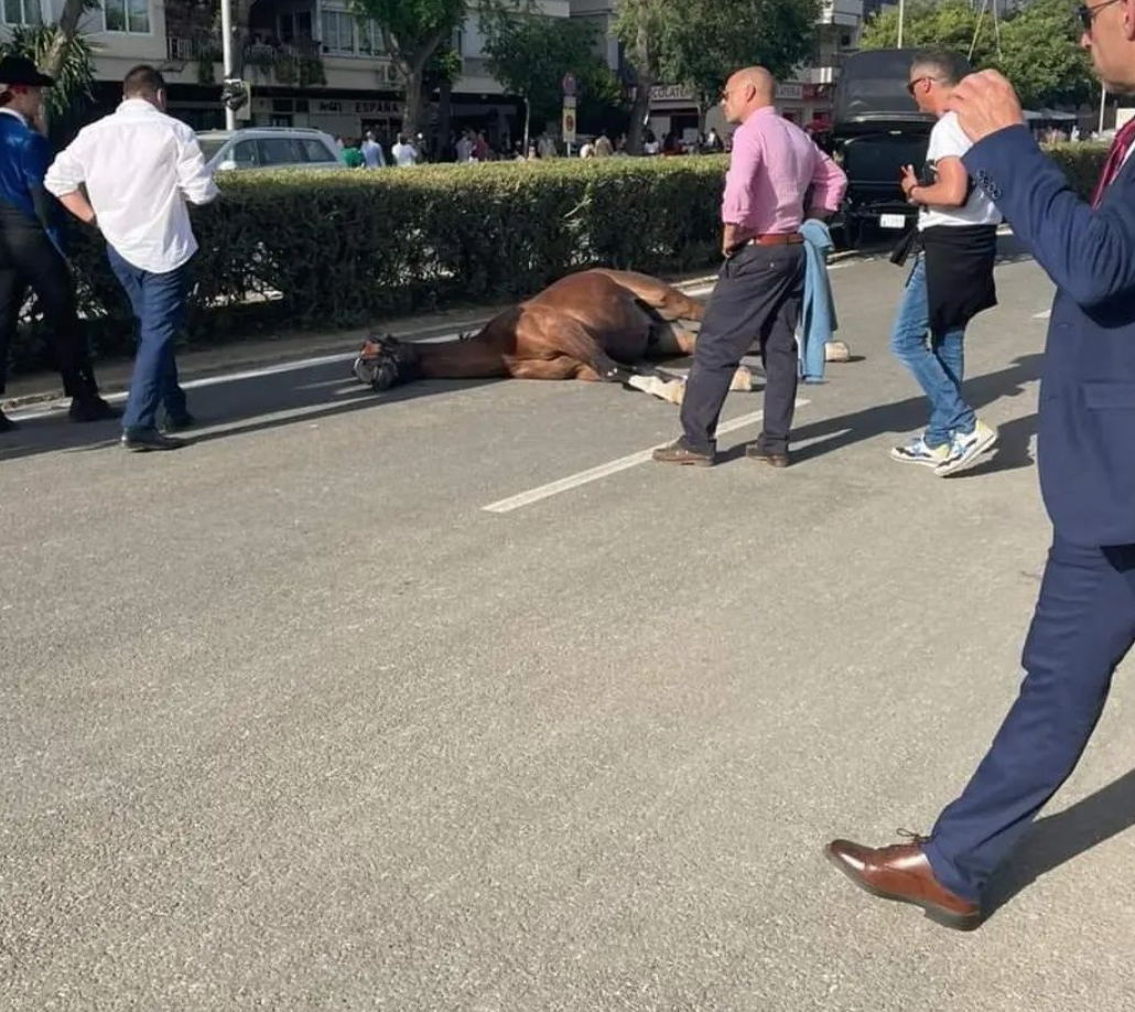 Varios caballos han sufrido golpes de calor en la Feria de Abril de Sevilla debido a las altas temperaturas. El Partido Animalista (Pacma) ha compartido en sus redes una foto de ayer, donde puede verse la dura imagen de un caballo fallecido en mitad de la carretera, mientras los viandantes paseaban.