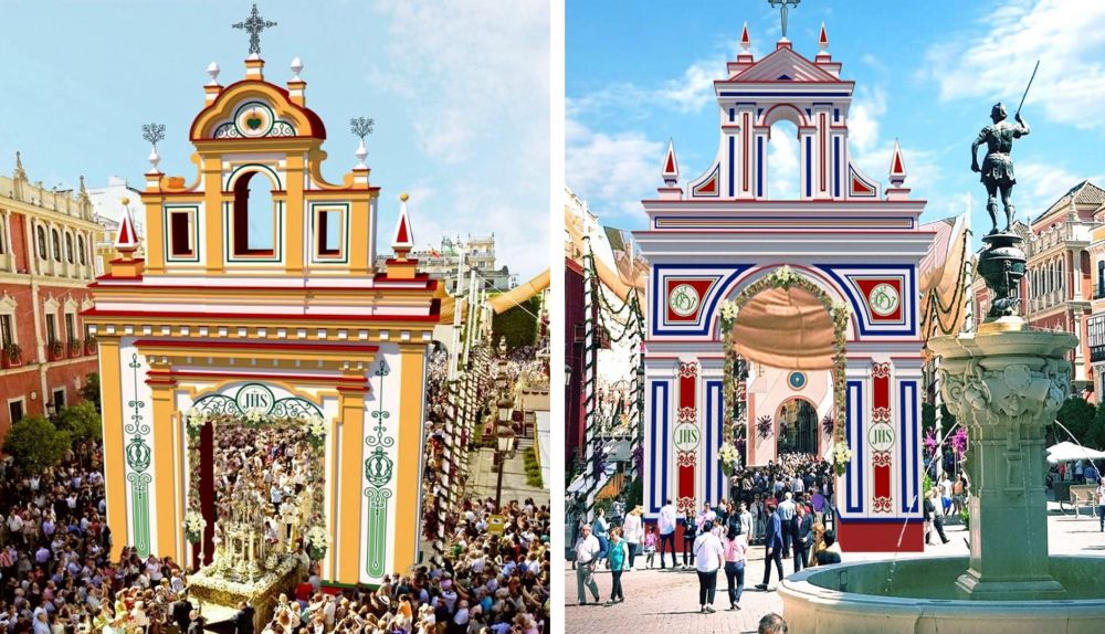 El Ayuntamiento de Sevilla ha dado a conocer as portadas del Corpus Christi 2025. El delegado de Fiestas Mayores, Manuel Alés, ha presentado el diseño en un acto celebrado en la sala Capitular Baja del Ayuntamiento. Ambos proyectos toman como referencia la capilla de los Marineros y la iglesia de Santiago.