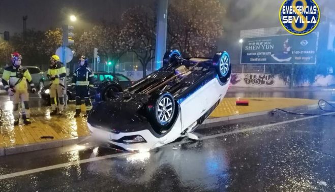 Emergencias Sevilla ha informado del caso y ha señalado que la conductora solo resultó herida leve, aunque fue necesaria la intervención de los bomberos para realizar el volteo del vehículo.