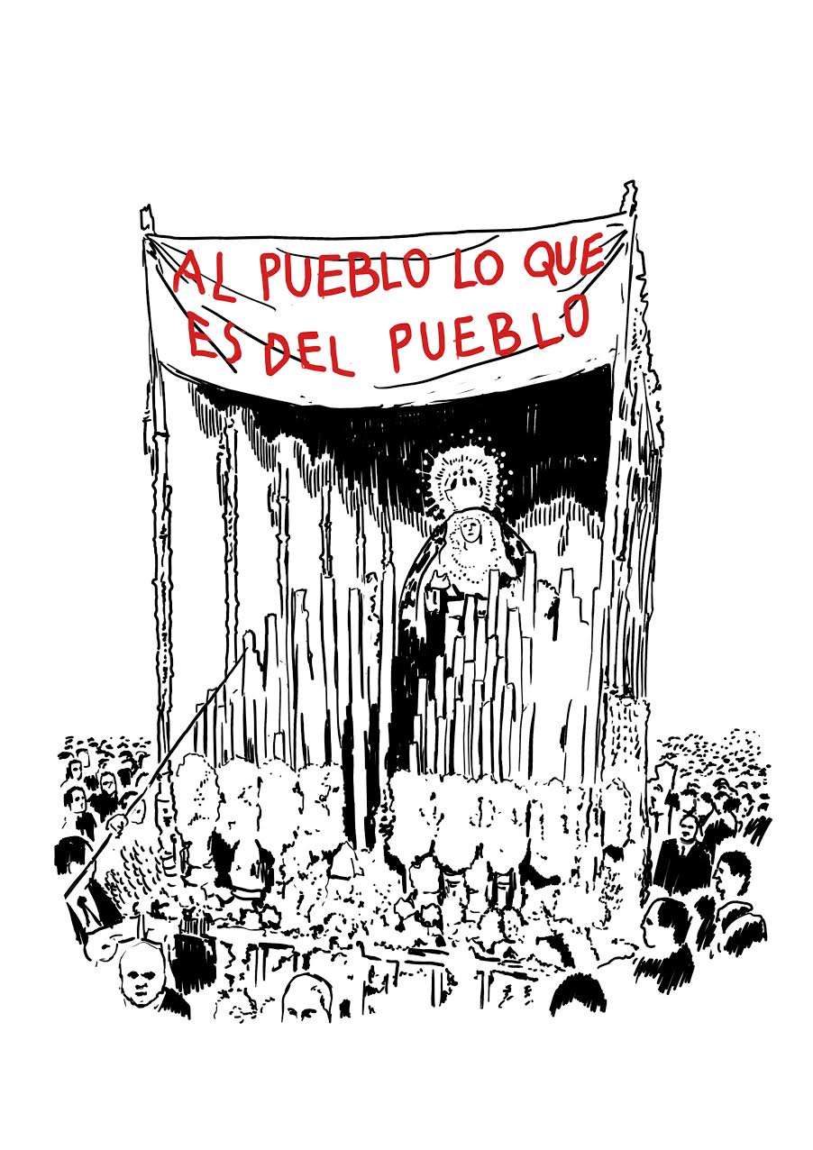 K: Justo al lado de mi casa han tirado la asociación de vecinos para construir un parque donde pudieran jugar los niños y pasar el rato las familias y los vecinos, pero lo único que han hecho es pavimentar una zona de albero. Han puesto unas cuantas máquinas de ejercicios y no han colocado ni un banco. Lo de los bancos tiene un fin muy claro: que la chavalería no se junte. Y en Sevilla hay un objetivo, el de sacar a la población de la calle. Ha sido muy descarado cómo han empezado a quitar los bancos de las plazas. Un ejemplo muy significativo es el de la plaza del Pelícano, una de las míticas paradas que ha tenido el centro de Sevilla, junto a los bancos del Pumarejo, donde en realidad los han conservado porque les han metido reposabrazos para que la gente no duerma allí. Esa idea de sustraer a la gente de la vida en la calle ha sido potentísima en Sevilla. La Alameda es el único bastión donde la gente se junta de forma masiva en el espacio urbano y se permite porque es un reclamo turístico. Sin embargo, otros puntos de la ciudad se los han cargado. Las plazuelas eran patrimonio de la gente que siempre estaba en la calle; la plazuela era de los yonkis, era lo que les quedaba. Un sitio cobijado, seguro, donde te ve mucha gente y tienes algo de seguridad. Eso ha desaparecido. La Plaza de San Lorenzo, por ejemplo.
