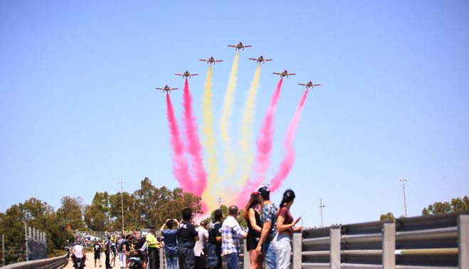 De cara al miércoles, la demostración prevista por la patrulla Águila con siete aeronaves modelo C-101 constará de dos sobrevuelos muy parecidos, que tendrán como punto de partida la zona de la esclusa y finalizarán en el espacio aéreo correspondiente al puente del Alamillo.