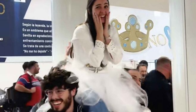 La novia, que iba vestida de blanco con una falda de tul, acabó a hombros en el Aeropuerto de Sevilla. Tras la fiesta en tierras andaluzas y su posterior regreso a casa, las jóvenes subieron los momentos vividos en el vuelo con una petición especial: localizar a quienes habían estado cantando durante el recorrido. "¿Será capaz TikTok de encontrar al grupo que nos hizo la fiesta y nos cantó la hora y media de vuelo durante la despedida de soltera de mi amiga?", preguntaba una de las jóvenes.