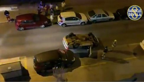 El turismo impactó con cuatro coches estacionados en la calle mencionada, cercana a la glorieta Berrocal de la ronda de circunvalación SE-30 de la capital, al perder el control por completo. Finalmente, el vehículo terminó volcado en medio de la carretera como consecuencia de los choques.