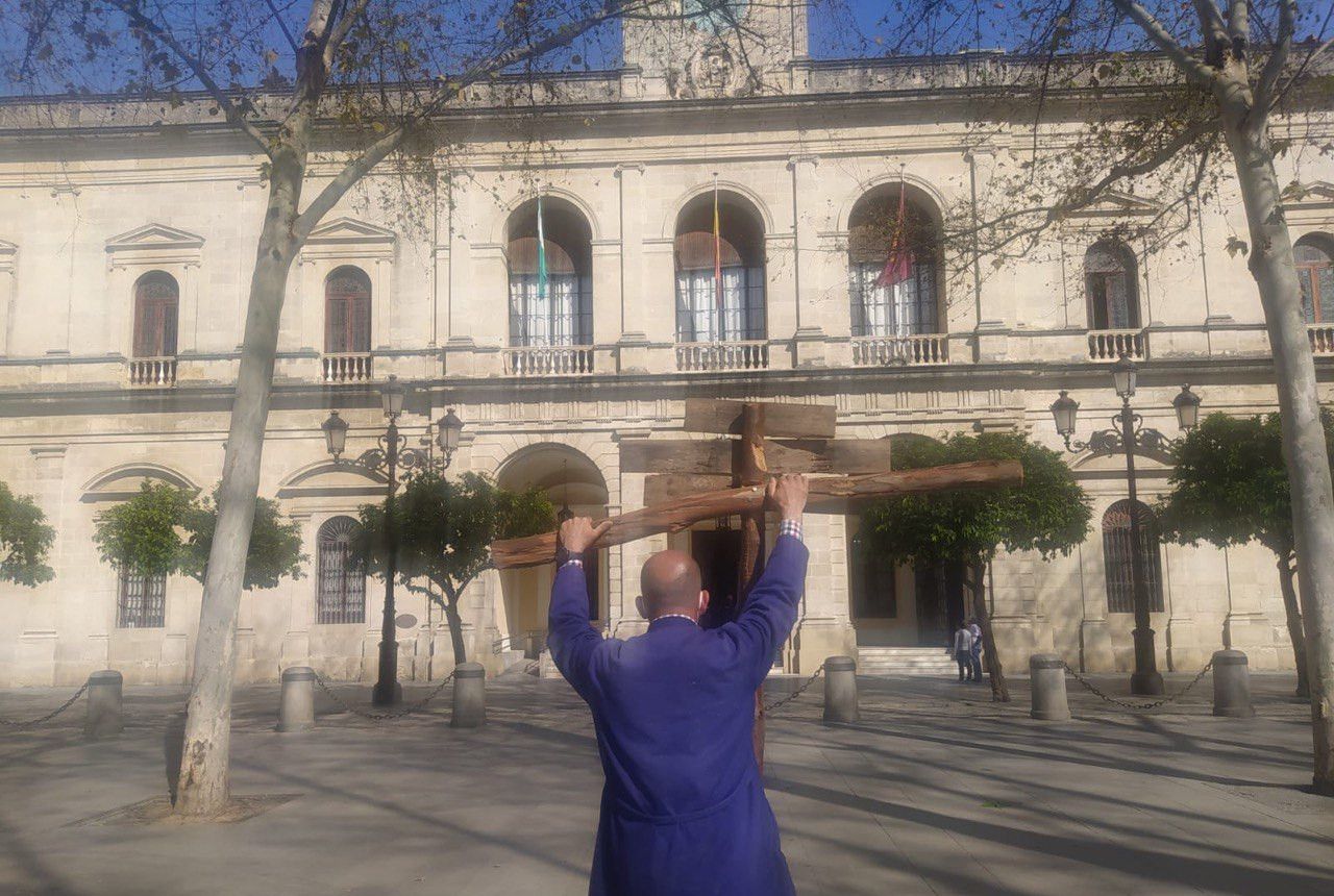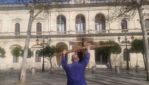 Jesús Moreno Naranjo lleva nueve años denunciando "el robo" de su puesto de trabajo como impresor en el Ayuntamiento de Sevilla. El ex empleado municipal se manifiesta en la plaza Nueva para llamar la atención del consistorio con el fin de que se abra la bolsa de empleo. El ex empleado con 20 años de experiencia en el sector de las artes gráficas se ha manifestado, esta vez, portando una cruz en la que se lee "Espadas El Pilato" que ha elevado frente a la puerta del edificio municipal.