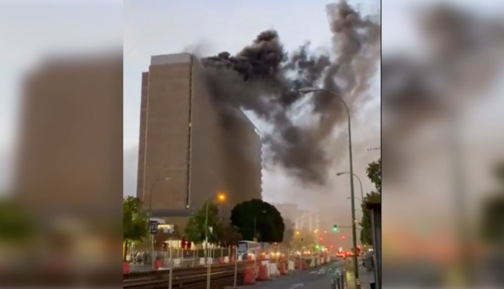🟥Un dispositivo de #Bomberos @PoliciaSevilla @policia y #E061 está interviniendo en un incendio declarado a las 20:25 h. en una estancia de un hotel en la Av. Luis de Morales.