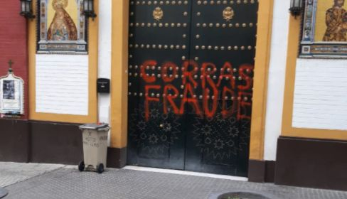 En esta ocasión, una pintada y el destrozo de la cerradura de entrada a la capilla han sido los daños ocasionados. En el caso de la pintura, realizada en grande y con color rojo, se podía leer "Corras fraude". Una frase sin mucho sentido, pero que tal vez pueda tener relación con Ángel Corpas, hermano mayor de la junta de gobierno de Los Panaderos. Tal vez, el individuo o los individuos que han protagonizado este suceso, se equivocaron al escribir el apellido.