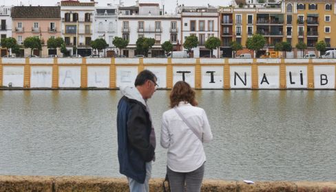 La separación del río con la calle Betis ha sido objeto esta noche de una pintada de grandes dimensiones visible perfectamente desde las avenidas colindantes al centro de Sevilla. Así, esta reivindicación en pleno conflicto en Gaza ha sido realizada de forma que sea vista por miles de personas desde puntos como el Palacio de San Telmo los puentes que cruzan hacia Triana y Los Remedios.