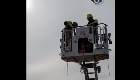 Para su rescate, tras ser asistida en la azotea del inmueble por sanitarios, ha sido preciso activar un vehículo articulado de altura, que se ha tenido que emplear a fondo, como se aprecia en el vídeo, para evacuar a la persona herida.