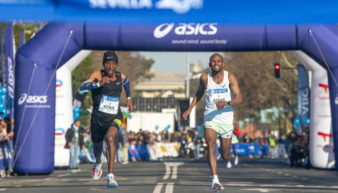 Maratón con llegada de 100 metros en Sevilla. Con un tiempo oficioso de 2:03.58 ambos, el ganador se decidirá en la foto finish