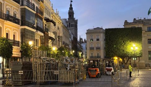 Esta semana ha comenzado el montaje de los palcos de la Carrera Oficial en la Plaza de San Francisco de Sevilla, con motivo de la próxima Semana Santa. La instalación del material ha generado controversia entre el sector hostelero, que ha mostrado su malestar por la ubicación elegida. La Asociación de Hosteleros de Sevilla y Provincia ha señalado que el acopio se realiza en "una zona autorizada para la instalación de terrazas de veladores".