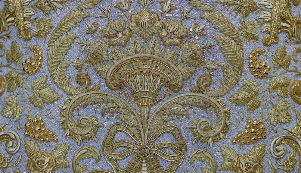 La ornamentación, de marcado carácter vegetal, se organiza en torno a un eje central simétrico, ocupando la superficie completa de la prenda y los extremos de las mangas.