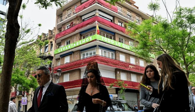 Sin embargo, hay elementos que rompen la estética y han corrido mejor suerte. Uno es el escudo del Betis situado en la plaza de la Campana, donde una peña tiene su sede. Otro, el balcón de la sede de Vox en la esquina entre Orfila y Laraña. Este espacio ha sido más comentado por su apariencia durante la Semana Santa. Mientras el resto de balcones del edificio mantienen las colgaduras burdeos, Vox tiene desplegada una pancarta gigante donde se lee "levantaremos todo lo que derriben".